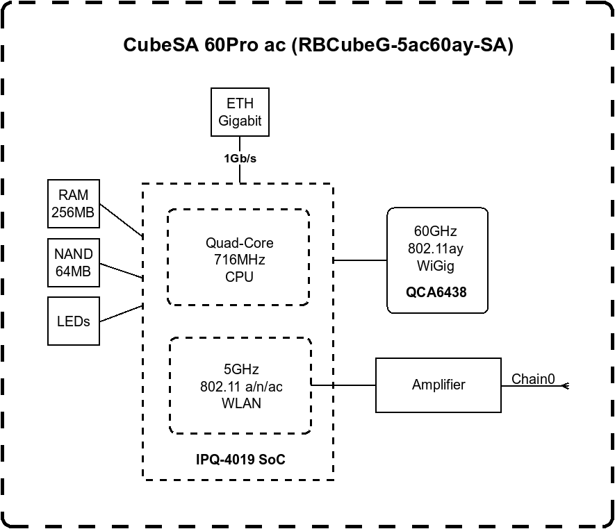(CubeG-5ac60ay-SA) CubeSA 60 Pro ac Sector Base Station with RouterOS L4 licenseA powerful sector antenna to connect multiple 60 GHz devices. Quick and easy networking for all kinds of pop-up events and distances up to 800m.Long gone are the days when you had to rely on cables for speed and stability. 60 GHz solutions offer fiber-like speed and stability - while saving you plenty of time and money on installation and maintenance. Our latest Cube 60Pro product line is taking the advantages of 60 GHz networking to the next level – with the 802.11ay standard for even higher distances, stability, speed, and convenience. If you need to connect multiple devices – take a look at the CubeSA 60Pro ac sector antenna. Reaching distances around 600 meters in point-to-multipoint mode, this device can be very helpful for all kinds of event management: from live shows, festivals, and workshops to construction sites, pop-up vaccination clinics, and so on. No need for complex wired installations in every location – the portable and handy CubeSA 60Pro ac has got you covered! Depending on your setup, the distance can be even greater. For example, with devices like MikroTik nRAY, you can reach up to 800 meters. Forget about downtime with the automatic 5 GHz backup connection The 60 GHz frequency is unaffected by the crowded wireless spectrum, it offers high speed and capacity. But it can sometimes struggle during bad weather conditions. That’s why both Cube 60Pro devices feature an automatic 5 GHz failover. We have added a powerful directional antenna so that the 5 GHz range can keep up with the 60 GHz. More durability, less unwanted attention We have upgraded the enclosure to feature a strong metal base – for better mounting and cooling options. The Cube form-factor emerges from pure practicality: it is durable, unobtrusive, and compact. |