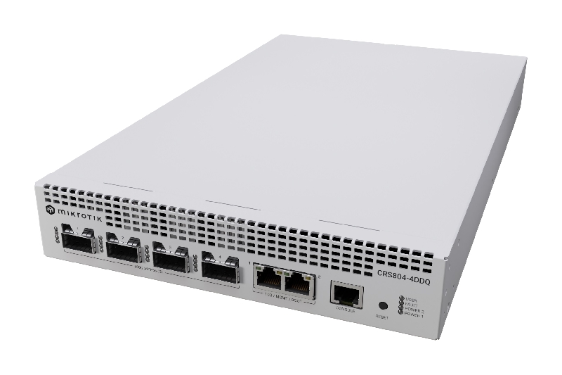 (CRS804-4DDQ-hRM) Cloud Router Switch CRS804 DDQ with RouterOS L6A compact 1U 400G switch built for AI clusters, storage fabrics, and high-speed aggregation, featuring four 400G QSFP56-DD ports, dual 10 Gigabit Ethernet, and RouterOS v7. With hot-swap power supplies, robust cooling, and low power consumption, it delivers ultra-high bandwidth, wire-speed performance, and future-proof scalability at an accessible price point.The CRS804 DDQ is a compact and reliable 400 Gigabit switch designed for modern AI workloads and next-generation network upgrades. With four 400G QSFP-DD ports and dual 1/10G Ethernet, it delivers exceptional bandwidth density in a quiet and efficient 1U form factor. Inside, a Marvell 98DX7335 switch chip works together with a hefty quad-core 2.0 GHz ARM CPU, 4 GB of DDR4 RAM, and RouterOS v7. This provides advanced traffic control, high performance switching, and a familiar management environment trusted by users worldwide. |
